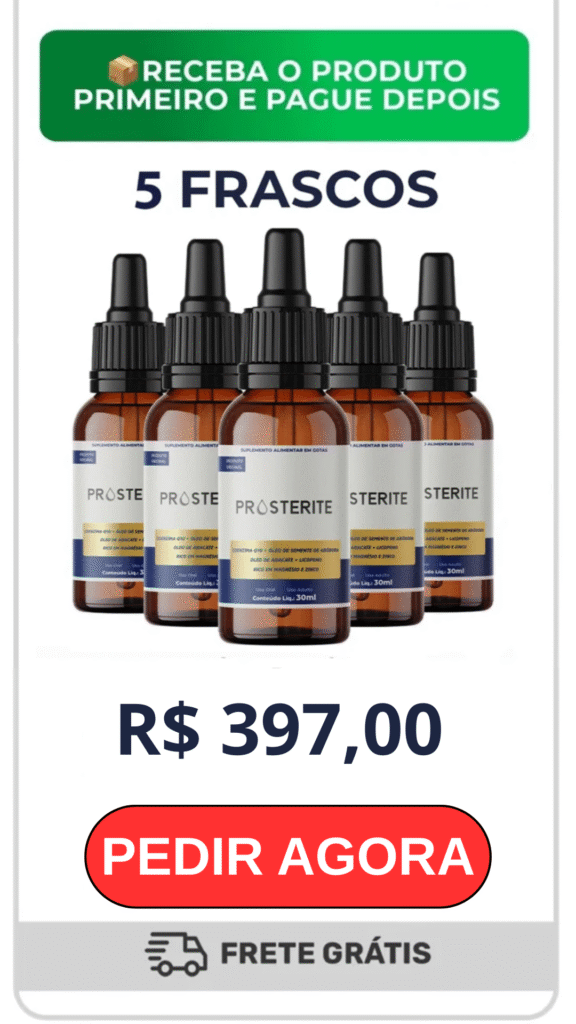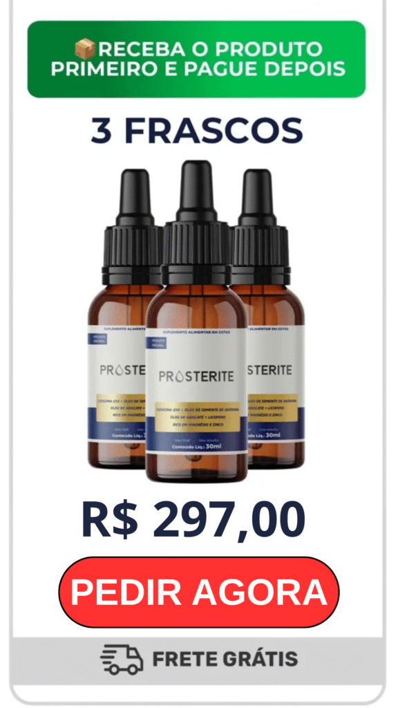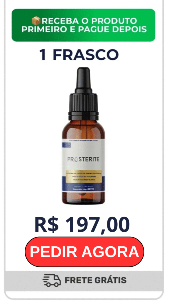 O Prosterite chega para quebrar esse bloqueio. Sua fórmula ultra-concentrada age diretamente na desinflamação da glând, ‘murchando’ a próstata para o tamanho saudável. O resultado? O canal é liberado, o sono volta a ser contínuo e a sua virilidade é destravada naturalmente.